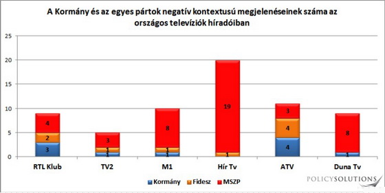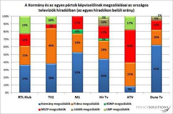 Az elemzés szerint a legpártatlanabb az RTL Klub, a közszolgálati tévé azonban még a Hír TV-nél is jobban húz a kormánypárti politikusok felé. A belpolitikai híreket a TV2-n 84%-ban, az M1-en 83%-ban, a Duna TV-n 82%-ban, a Hír TV-n pedig 72%-ban fideszes vagy KDNP-s képviselők kommentálják. Az ATV-n ezzel szemben jelentősen alulreprezentáltak a kormánypártiak, az MSZP viszont jóval többet szerepel az átlagosnál.