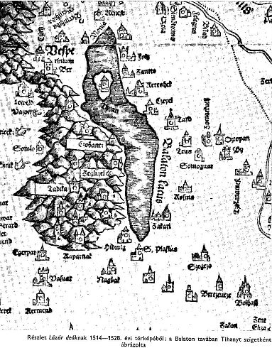 Tihany félsziget hajdan sziget volt. Erről oklevelek tanúskodnak. 1055-ből származik I.András király alapító levele, amelyben a bencések szt.Ányos monostorának ajándékozza Tihany szigetet. Felsorolja azokat a helyiségeket, amiket I. András az apátságnak adományozott Ezek: Tichon sziget és vár, Kövesd, Örvényes, Udvari, Pécsely, Vászoly, Szöllős, Raposka, Füred, Arács, Csopak, Aszófő, Lápa, Ság, Szemes, Igal, Cseuz, Fok, Csór, Bár, Apátlaka, Tósok, Berénd, Boglár, Révfülöp, Besenyő, Gyisznód.