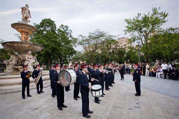 Budapest, 2011. május 23. A Központi Tűzoltózenekar ad térzenei koncertet az Európai Unió polgári védelmi főigazgatóinak a soros magyar EU-elnökség alkalmából Budapesten megrendezésre kerülő 26. ülése alkalmából az V. kerületi Erzsébet tér szökőkútjánál.