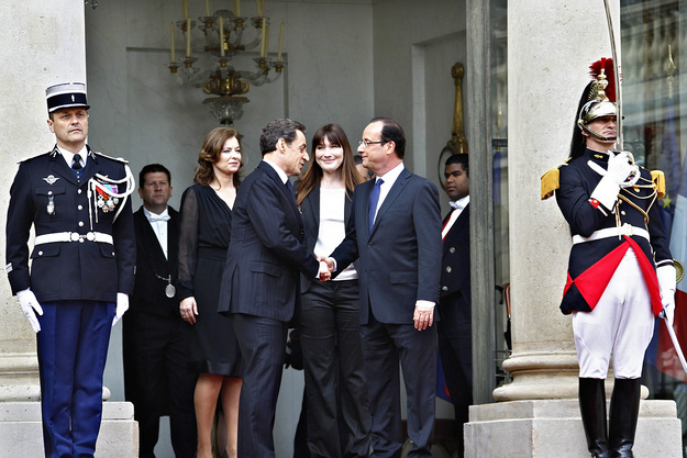 A szigorú protokoll szabályoknak megfelelően az Elysée-palota lépcsőjén Sarkozy fogadta a gépkocsin érkező Hollande-ot, aki kamerák kereszttűzében vörös szőnyegen vonult át az elnöki hivatal díszudvarán. Franciaország búcsúzó és érkező elnöke hosszan kezet rázott, majd mintegy negyven perces megbeszélésre félrevonultak. Ennek során Sarkozy egyebek mellett a francia nukleáris erő titkos kódját és az azzal kapcsolatos bizalmas információkat adta át utódának.
