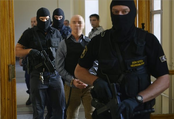 Jozef R. elsőrendű vádlottat vezetik a Fenyő-gyilkosság büntetőügyében indított per tárgyalására a Fővárosi Törvényszéken 2014. július 10-én.