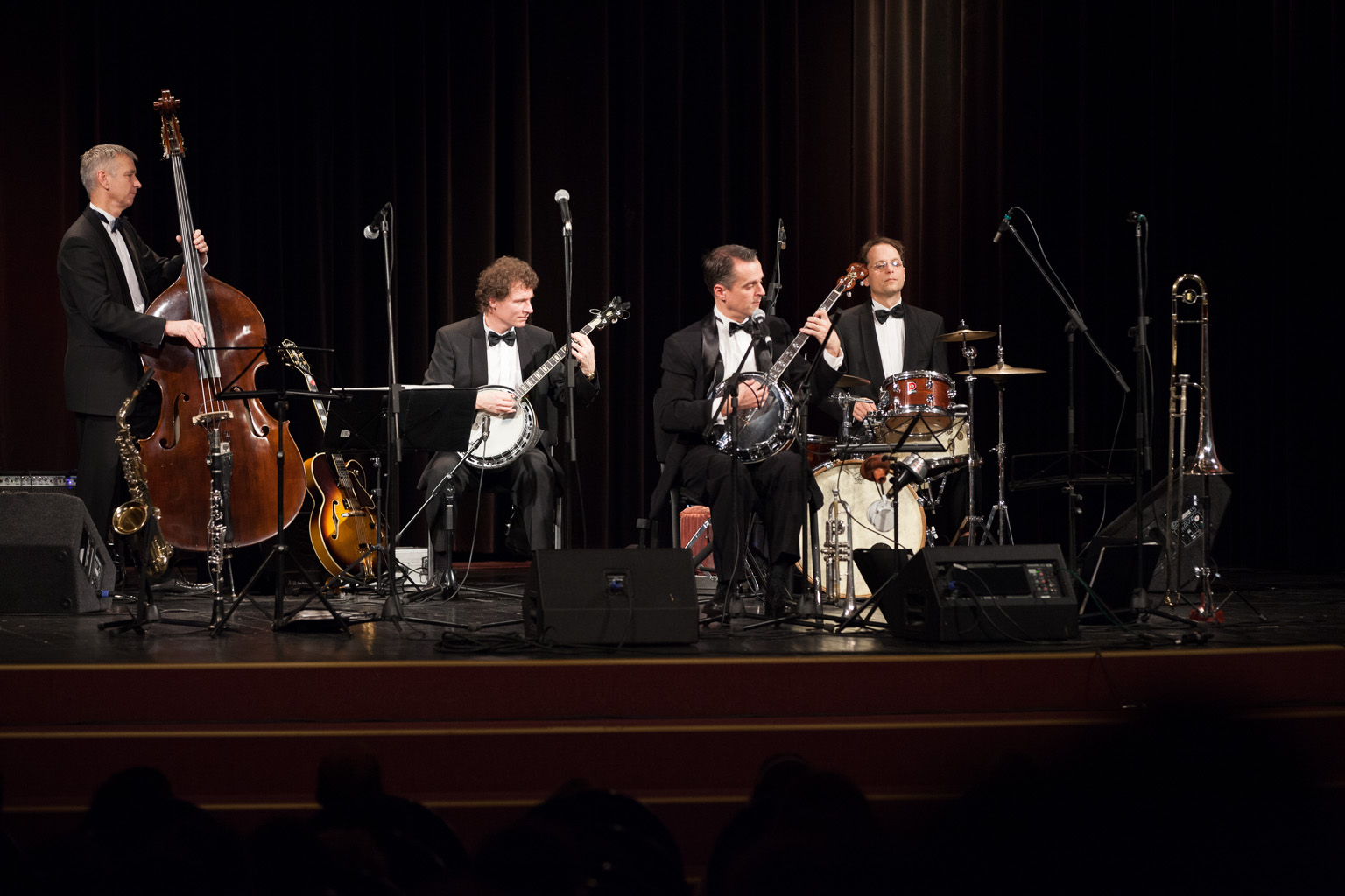 Budapest, 2015. március 19. Az idén megosztott Kossuth-díjjal kitüntetett Hot Jazz Band együttes tagjai balról jobbra: Bera Zsolt, Juhász Zoltán, Szabó Lóránt Hunor, Bényei Tamás, a zenekar alapítója és vezetője, Galbács István Tibor és Fodor László a budapesti Lado Caféban 2015. március 18-án.
