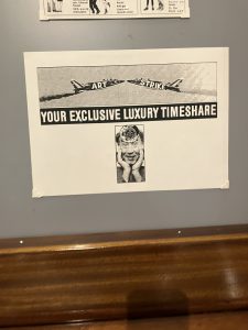 Ezen a  kiállításon is voltak kedvenc munkák, mint a két egymásnak suhanó vadászgép, Art Strikes feliratokkal, melyekben mi két ideológia karikatúráját véltük felfedezni, a kommunizmus és nácizmus romboló hatását, vagy a felirat “Your Exclusive Luxury Time Share” magyarázatok nélkül is érthető az irónia, és társadalomkritika, aztán mindenki olyan korszak kritikáját látja belé, amit akar.