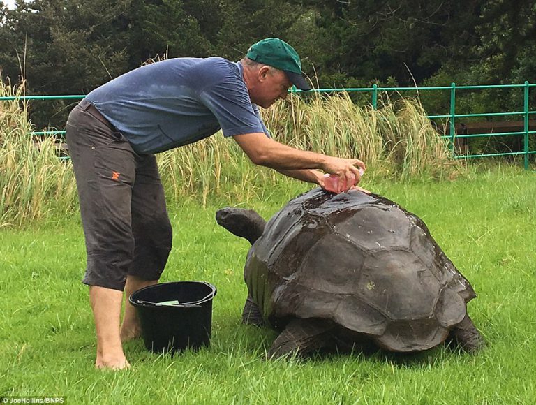 Először fürdették meg a világ legöregebb állatát, Jonathant, a 184 éves óriásteknőst, hogy a közelgő uralkodói látogatásra előkészítsék.