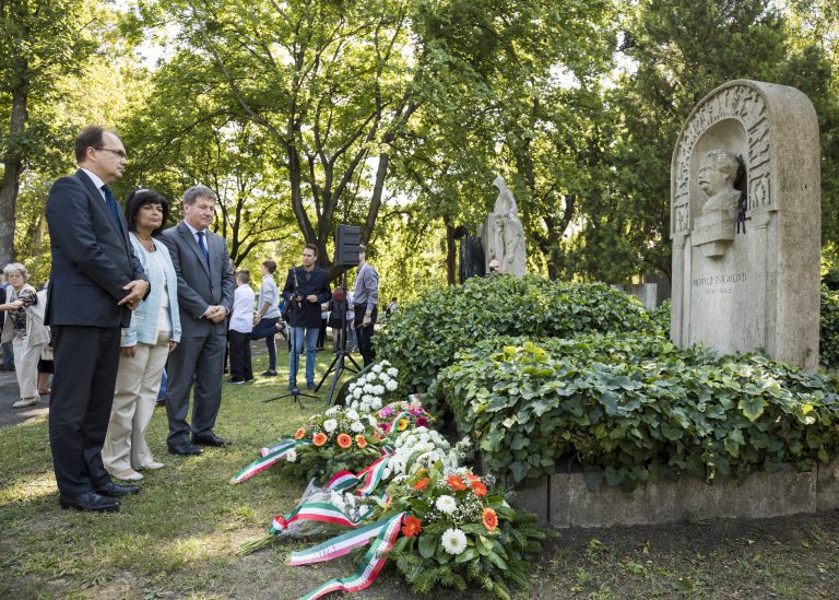 Koszorúzással és főhajtással emlékeztek a hetvenöt évvel ezelőtt elhunyt Móricz Zsigmondra sírhelyénél kedden, a Fiumei Úti Sírkertben, Budapesten.