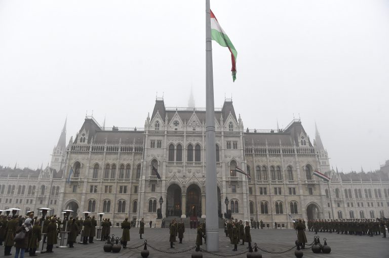 Felvonták, majd félárbócra eresztették a nemzeti lobogót a veronai buszbaleset áldozataiért elrendelt nemzeti gyásznapon, hétfő reggel az Országház előtt.
